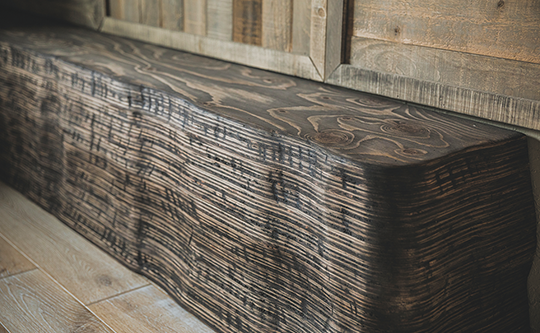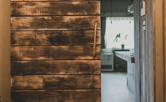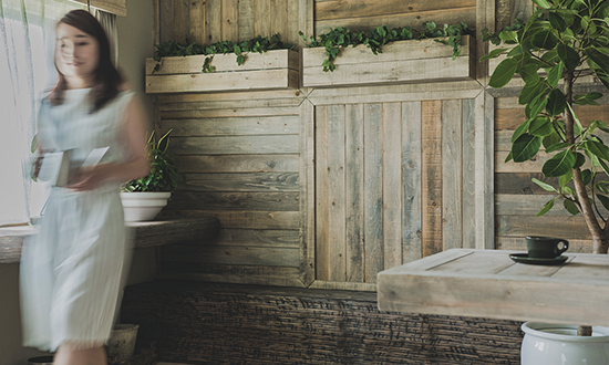 風や雨にさらされたような質感の木をたくさん使い、